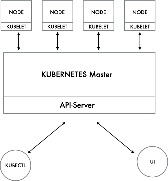 As in most clustered systems the Kubernetes platform has a Master Node which is responsible for the platform management function and Worker Nodes which host the Pods. The Master Node provides the API for managing the cluster. As such it may be viewed as for example the AWS Cloud which provides a REST API for management, The KubeCTL which is like the AWS-CLI and the UI which is the AWS Console. Both the UI as well as the KubeCTL utilize the underlying API.